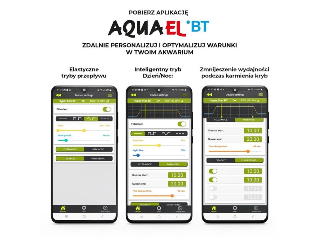 Upravte nastavení filtru podle životního cyklu vašich ryb. Režim Den/Noc automaticky mění parametry filtrace tak, aby se přizpůsobily přirozenému rytmu aktivity vašich ryb. Inteligentní software aplikace Aquael BT automaticky řídí osvětlení a intenzitu filtrace, čímž podporuje zdravý vývoj flóry a fauny.