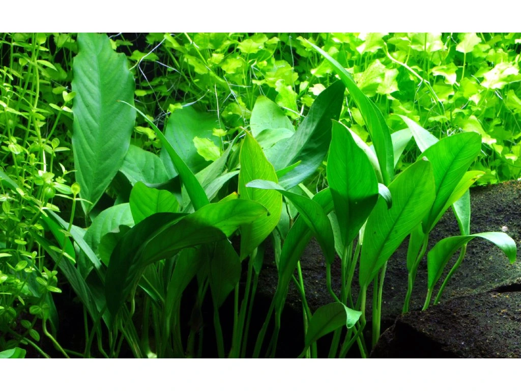 Anubias barteri var. glabra ze západní Afriky je krásná rostlina s dlouhými, úzkými listy. Dorůstá výšky přibližně 10–20 cm a má oddenek, z něhož vyrůstají listy, dlouhý 10–15 cm i více. Je velmi snadná na pěstování, protože prospívá téměř za všech podmínek, je však vhodné vyhnout se silnému osvětlení. Ideální je umístění do stinnějších míst pod větší rostliny.