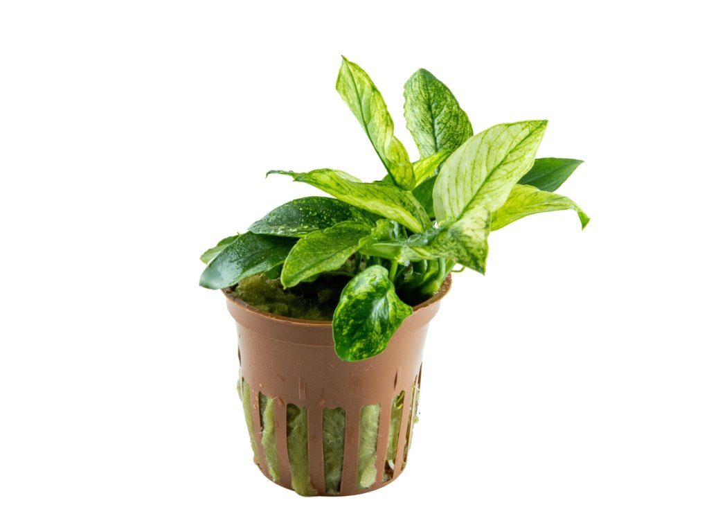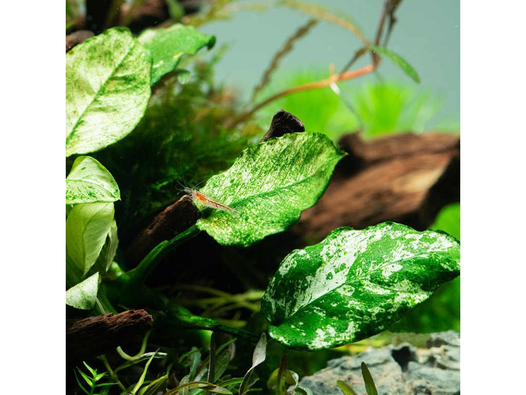 Anubias ‚Pinto‘ je exkluzivní, pečlivě vybraný kultivar druhu Anubias barteri. Listy o velikosti přibližně 3–6 cm nesou výrazné a atraktivní vzory v odstínech bílé, světle zelené a tmavě zelené. Kresba listů se může lišit v závislosti na podmínkách prostředí a za určitých okolností může rostlina vytvářet i zcela tmavě zelené listy.