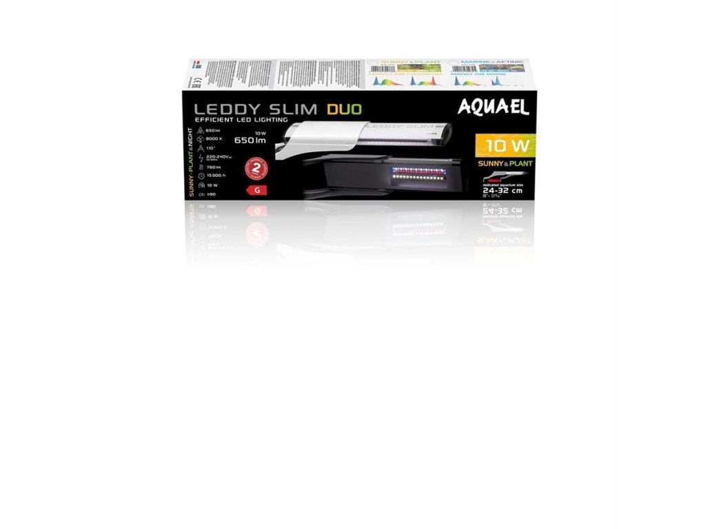 LEDDY SLIM DUO 10W SUNNY PLANT&NIGHT led lampa je určena k osvětlení sladkovodních otevřených nádrží o délce 20 až 30 cm.Obsahuje dvě řady LED diod s celkovým výkonem 10 W (2x5 W). Polovinu tvoří diody SUNNY vyzařující světlo podobné slunečnímu světlu (barevná teplota 7000 K), zatímco druhou polovinu tvoří diody PLANT vyvinuté speciálně pro potřeby rostlin (barevná teplota 9000 K).