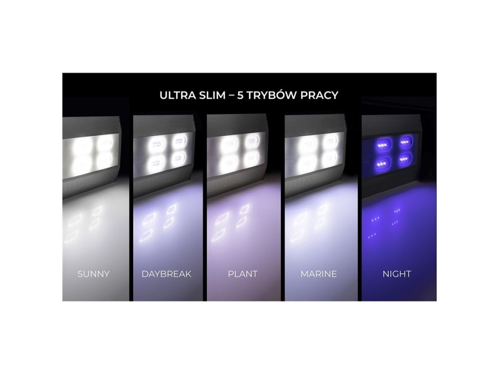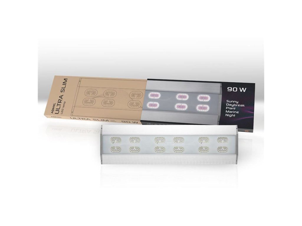 UltraSlim je akvaristická led lampa vybavená 5 světelnými režimy, díky kterým ji lze použít ve všech typech otevřených nádrží.Světlo lze ovládat manuálně nebo přes aplikaci Aquael BT volně ke stažení