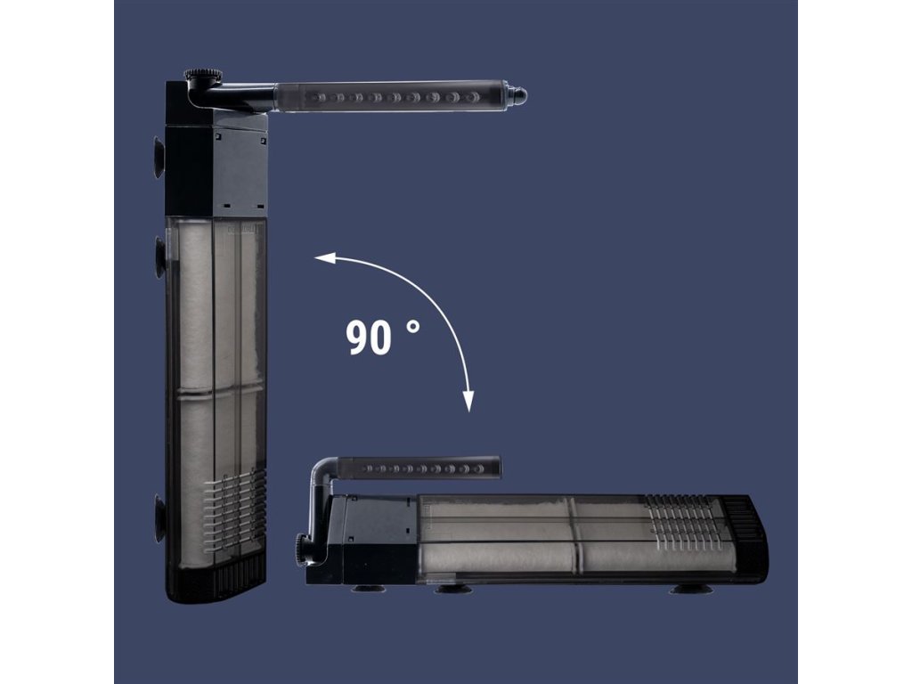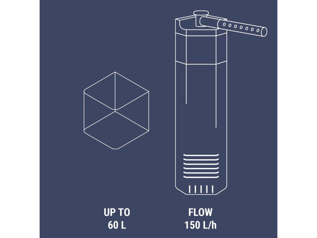 Tento rohový filtr nabízí plynule nastavitelný průtok vody (až 150 l/h) a otočný výstup o 90°, díky čemuž si proud vody přizpůsobíte podle potřeby. Díky velmi jemnému předfiltru je bezpečný i pro nejmenší krevetky. Je navržen tak, aby fungoval tiše, s minimální spotřebou energie (pouze 2 W). Údržba je rychlá a čistá – filtr stačí snadno vytáhnout a vypláchnout ve vodě z akvária.