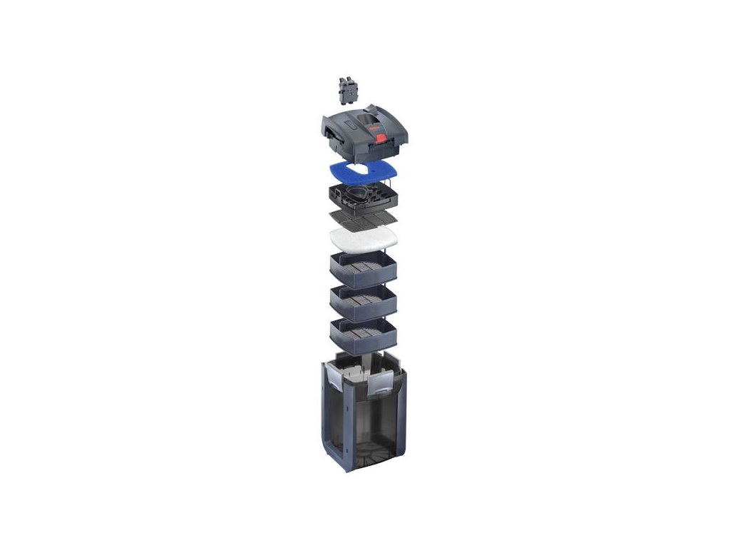 | Programy filtru Konstatní proud = filtr neustále udržuje stejný průtok i přes znečištění filtračních materiálů. Bio režim = filtr udržuje dva různé průtoky během dne např. silnější přes den a slabší v noci. Pulzní režim = Filtr střídá maximální a minimální průtok, tak aby vytvářel vlny na hladině akvária, vhodné např pro tlamovce. Manuální režim = Filtr proudí podle nastavenýho průtoku Další funkce: Automatické odvzdušnění, střídavým vypínáním a zapínáním. Indikace znečištění filtrace | |