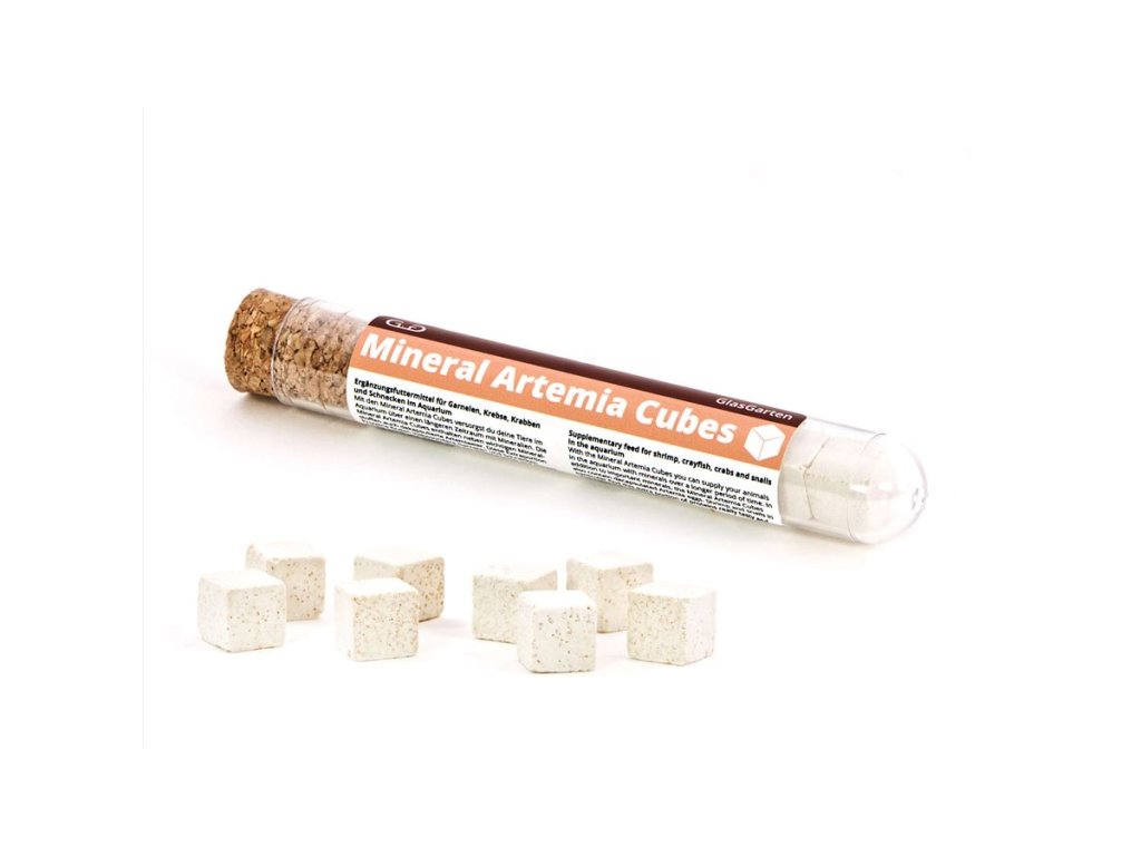 Doplňkové krmivo pro krevety, šneky, krabi a raky v akváriu/teráriu. S kostkami GlasGarten Mineral Artemia můžete zásobovat vaše akvarijní zvířata minerály po delší dobu. Minerální kostky artemie obsahují kromě důležitých minerálů také dekapsulovaná vajíčka artemie. Zejména krevetám a šnekům tato extra porce bílkovin opravdu chutná a navíc napomáhá regeneraci a dobré kondici.