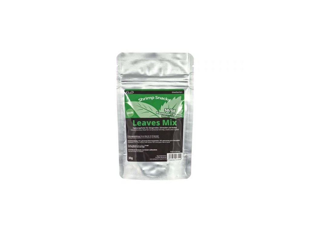 Shrimp Snacks Leaves Mix Sticks od GlasGarten jsou směsí 50 % listů kopřivy a 50 % listů zeleného ořechu. Tyto listové odrůdy jsou velmi oblíbené v chovu krevet a šneků i jejich šlechtění, protože kopřiva je důležitým dodavatelem vápníku, železa, hořčíku a bílkovin, s vysokým obsahem přírodních vitamínů a listy ořešáku jsou známé pro antibakteriální a plísňové účinky. Tyto druhy listů zelenýho ořechu a kopřiv jsou oblíbené zejména u krevet, hlemýžďů, raků a mladých sumců. Neznečišťují vodu a mohou zůstat v akváriu, dokud se vše nesní.