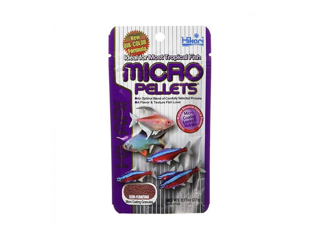 Krmivo se vyrábí s využitím nejmodernějších biotechnologických procesů a dodává tropickým rybkám celoročně zářivé zbarvení. Je složeno ze tří druhů pelet, každé s rozdílným obsahem a složením: Červené granulky: jsou výhradně živočišného původu, špičkového složení a obsahují dokonale vyvážený poměr aminokyselin. Zelené granulky: jsou rostlinného původu s vysokým obsahem dietní vlákniny, která podporuje zdravý vývoj ryb. Žluté granulky: obsahují vitamíny a minerály, které aktivují imunitní systém rybek a tím snižují riziko onemocnění. Napomáhají i snižování hladiny stresu. Hikari Micro Pellets je krmivo plovoucí, pomalu klesající, vhodné pro všechny druhy ryb živící se těsně pod hladinou či ve střední části akvária. Nikdy nekalí vodu! Každá miniaturní granulka je pokryta tenkou mikrovrstvou, která chrání výživné složky uvnitř tak, aby se při rozpouštění nevytratily.Firma Kamihata Fish Industries