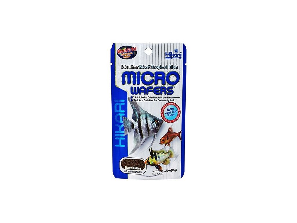Obsahuje vysoký podíl mořských a rostlinných proteinů pro zlepšení chuti, účinné trávení a maximální využití živin k růstu. Tento miniaturní mikro plátek je zvláště vhodný pro všechny ryby ve společenské nádrži, např.: skaláry, čichavce, barbusy, platy, mečovky, tetry, mřenky. Bohaté na spirulinu a astaxanthin podporující zářivé barvy, které postrádají konkurenční krmiva. Nabízí nízké náklady na krmení a zlepšení kvality akvarijní vody v porovnání s vločkovými krmivy.Hikari Micro Wafers jsou tvarem přizpůsobeny tak, aby většině tropickým rybkám, vyhovovali jak velikosti tak tvarem. Granulky jsou plovoucí a pomalu klesající, ve vodě měknou, ale nerozpouští se. Nikdy nekalí vodu a na rozdíl od vločkových krmiv se lze jednoduše vyhnout předávkování.