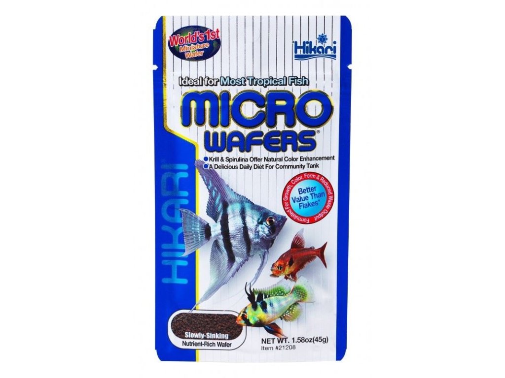 Obsahuje vysoký podíl mořských a rostlinných proteinů pro zlepšení chuti, účinné trávení a maximální využití živin k růstu. Tento miniaturní mikro plátek je zvláště vhodný pro všechny ryby ve společenské nádrži, např.: skaláry, čichavce, barbusy, platy, mečovky, tetry, mřenky. Bohaté na spirulinu a astaxanthin podporující zářivé barvy, které postrádají konkurenční krmiva. Nabízí nízké náklady na krmení a zlepšení kvality akvarijní vody v porovnání s vločkovými krmivy.Hikari Micro Wafers jsou tvarem přizpůsobeny tak, aby většině tropickým rybkám, vyhovovali jak velikosti tak tvarem. Granulky jsou plovoucí a pomalu klesající, ve vodě měknou, ale nerozpouští se. Nikdy nekalí vodu a na rozdíl od vločkových krmiv se lze jednoduše vyhnout předávkování.