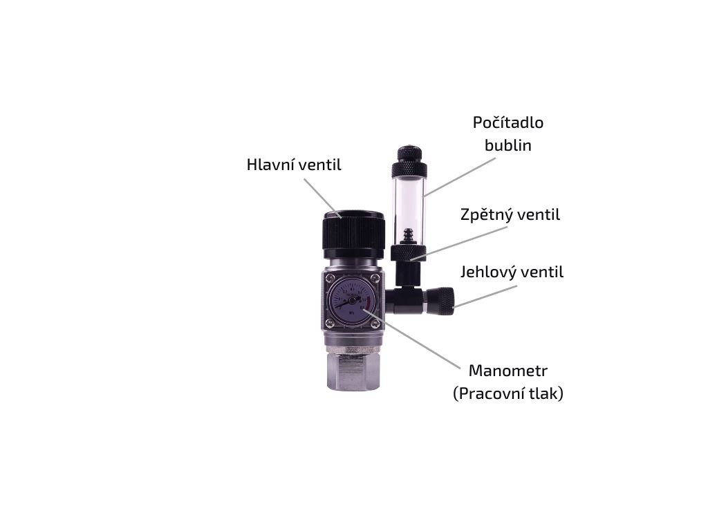 - Regulátor má vše, co pro záčátek potřebujete, manometr, solenoid, zpětný ventil a počítadlo bublin.
