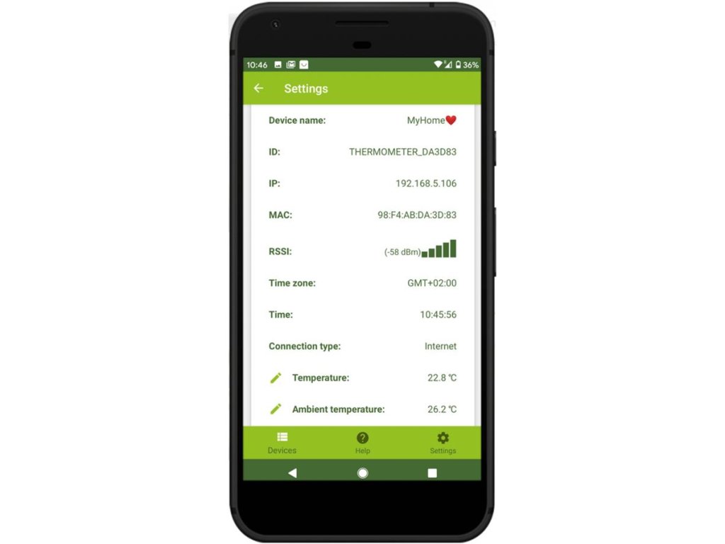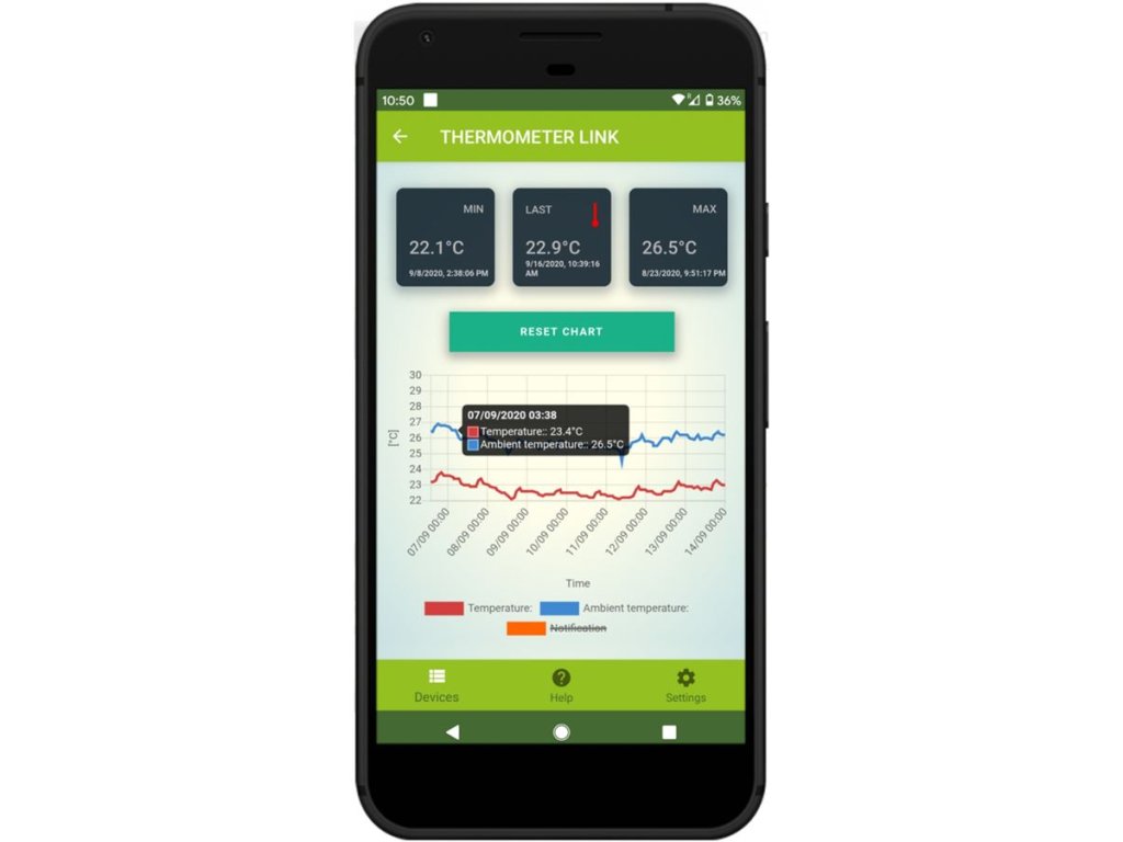 | Mobilní aplikace Umožňuje nastavit požadovaný teplotní rozsah. Pokud je teplota mimo nastavený rozsah, aplikace odešle alarmové oznámení. Zařízení zaznamenává a ukládá údaje o teplotě uvnitř i vně nádrže. | ![]() |