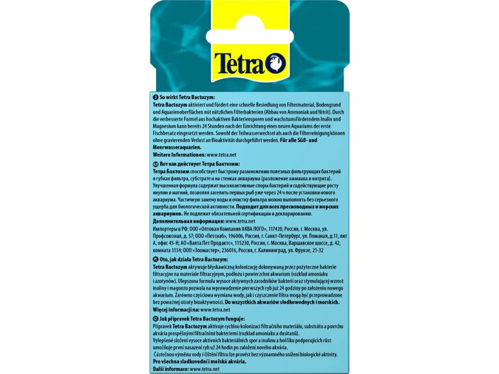 Tetra Bactozym urychluje nastartování biologické rovnováhy v nově založeném akváriu. Díky jedinečné kombinaci enzymů, spor a bioaktivních látek vytváří ideální podmínky pro osídlení filtru a dekorací nitrifikačními bakteriemi. Umožňuje nasazení prvních ryb už po 24 hodinách a chrání biologickou rovnováhu i při výměně vody nebo čištění filtru.