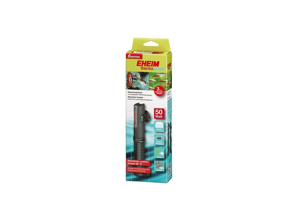 Jednodušší už to být nemůže: s EHEIM Thermopreset je přednastavena příjemná teplota pro obyvatele akvária. Vaše akvárium si udrží konstantní teplotu 25 stupňů Celsia. To je také optimální teplota pro chov nejběžnějších obyvatel akvária. Elektronická regulace zaručuje mimořádně vysokou přesnost / správnost teploty, vysoce účinné topné těleso zajišťuje rovnoměrné rozložení tepla.EHEIM Thermopreset se od EHEIM Thermocontrol liší dodatečnou plastovou ochranou, která zajišťuje vysokou mechanickou stabilitu. Jak je u společnosti EHEIM obvyklé, oba ohřívače jsou vybaveny LED kontrolkou pro kontrolu funkce ohřevu a ochranou proti chodu nasucho.