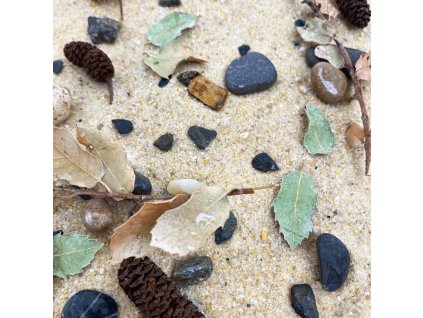 Směs písku a botanických prvků, frakce 0,1–40 mm, bezpečné a chemicky čisté, ideální pro delta, jezero a lagunový biotop, balení 3 kg.